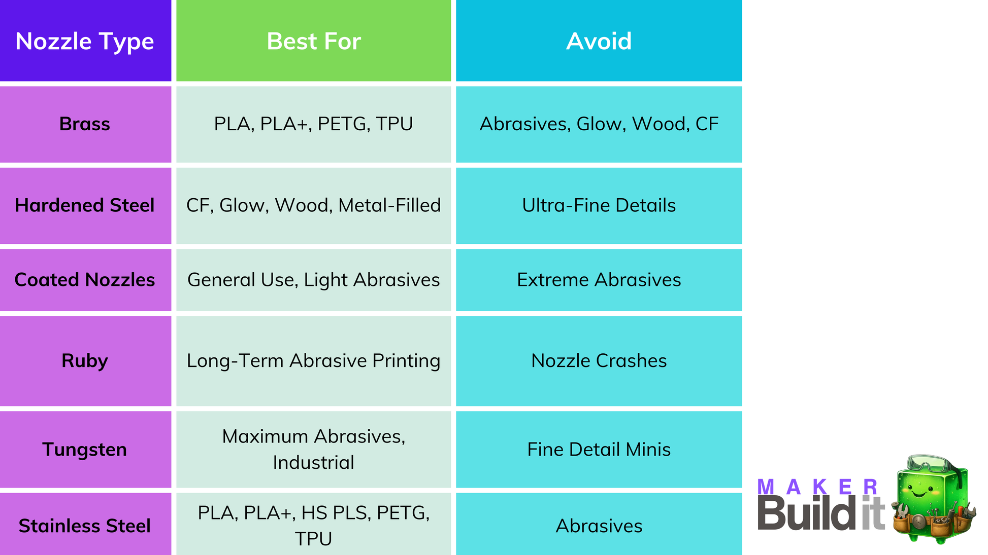 The MakerBuildIt Nozzle Guide breaks down the entire world of 3D printer nozzles into something simple, clear, and actually useful. Whether you’re just starting out or upgrading your print setup, this PDF gives you exactly what you need to choose the right nozzle for your prints, your materials, and your printer.